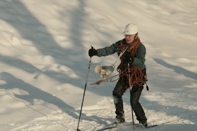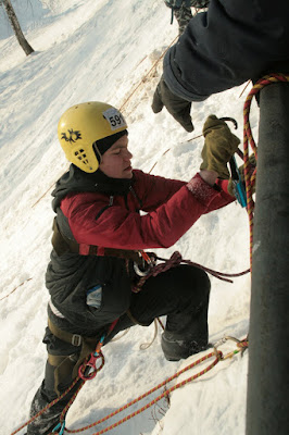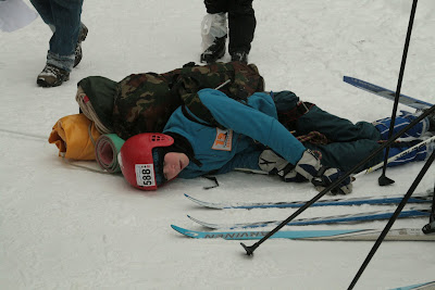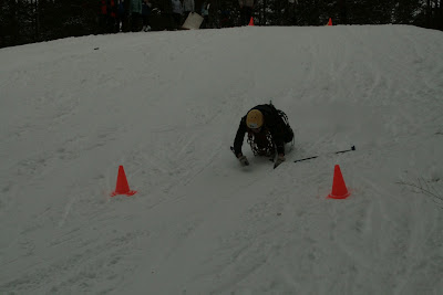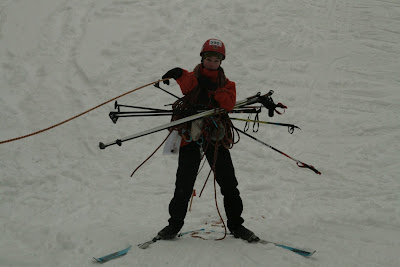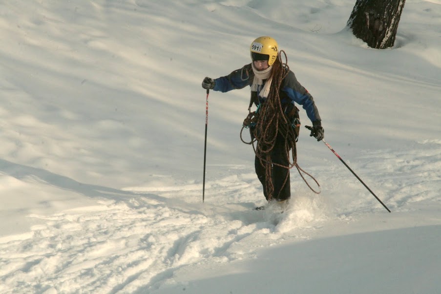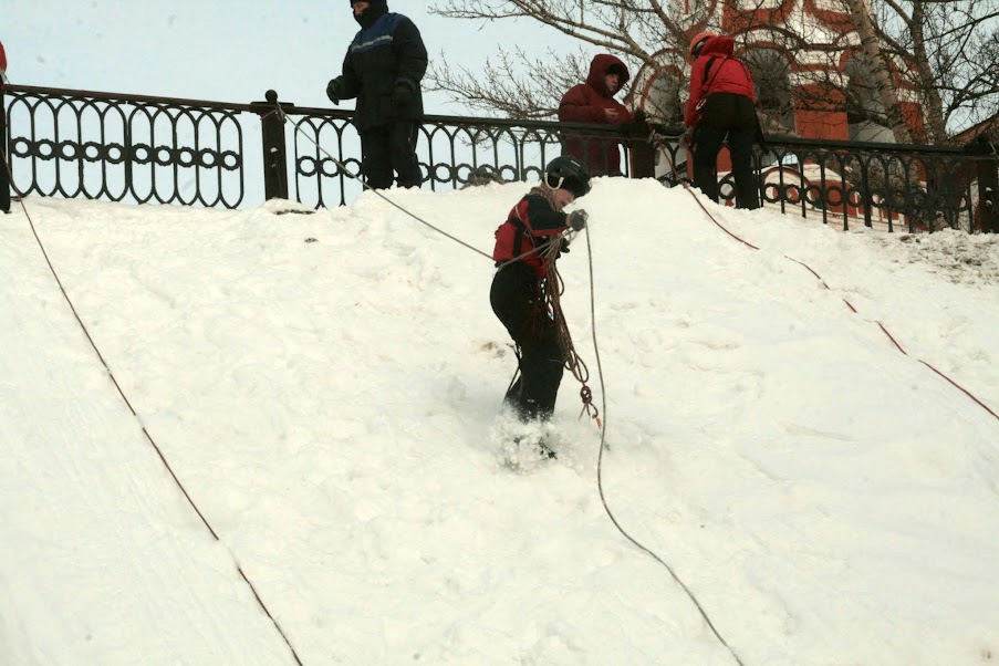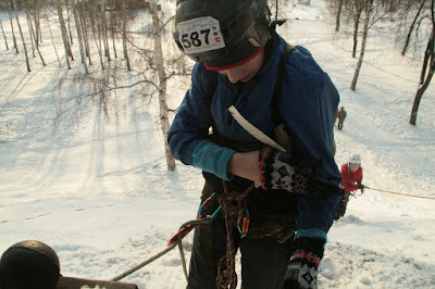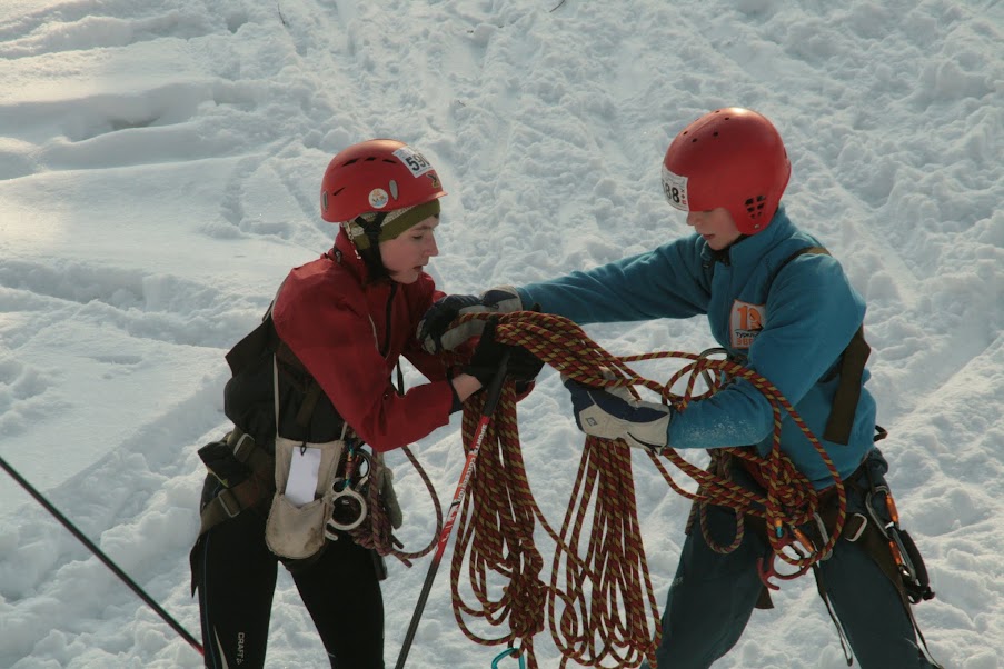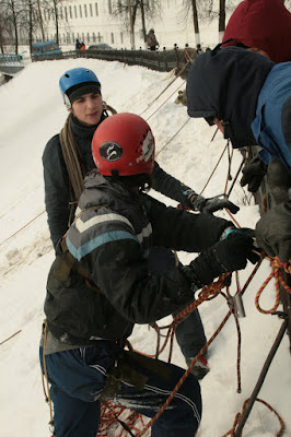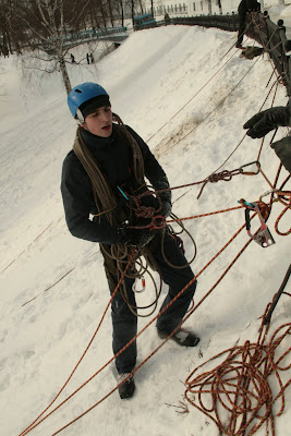Круто-та кончено! Я валялась на склоне, судья принес мне лыжину, улетевшую вниз :D Я одной рукой пыталась одеть её, а второй передавала веревку Максу. Он все там сделал и сказал мне страховать его. Я одела лыжу и страховала его. Макс спустился и принимал меня. Наша веревка запуталась хуже некуда! Ладно, спуск был 5 метров, а то и меньше, поэтому мне спускаться некуда было, я уже внизу валялась :D Поэтому просто сделала 2-3 шага назад. Пока я отмечалась и надевала лыжи, Макс мотал и одновременно распутывал веревку. Я пришла на помощь, распутала один узел и уехала.