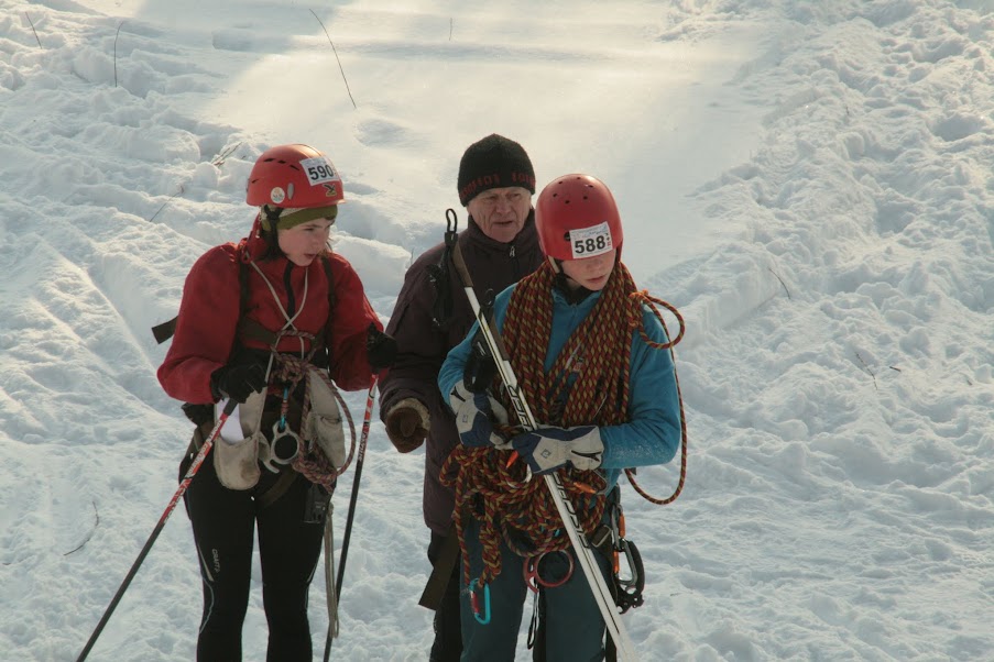 Судья нам сказал, что это нужно только на спуске, поэтому мы облажались сильно, потеряли время. Макс пошел первый. Перешел на траверс и пошла я. Я там на подъеме чуть не грохнулась. Дошла до Макса на траверсе, чтобы передать веревку и выпустить его вниз, но в этот момент моя лыжина, а именно левая нога, поехала вниз :D Ииии...я грохнулась. И конечно же сработала система Александры Ивановны, самоотстежка лыж!