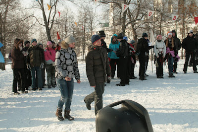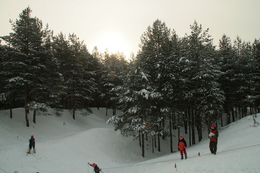 Я поехала первая на спуске, затормозила, уф. Кстати, спуск с торможением был более положе, чем на котором мы тренировались, это всех порадовало) Но были команды, которые и на таком спуске не смогли затормозить. Макс затормозил, я отметилась и мы убежали на параллелки. Их мы прошли вообще шикарно) Приехали, отстегнули лыжки, я начала их собирать вместе, чтобы переправить, а Макс готовил веревку и уже был готов идти. Когда я собрала, я его страховала, он переправился и я вешала лыжи на нижние перила. Лыжи переехали, потом пошла я. Все было достаточно быстро, как мы и хотели. Макс быстро смотал веревку, я отметилась и мы убежали на бревно . На втором этапе у нас была отсечка. Мы стояли и ждали пока освободится какая-нибудь ветка. Пока мы стояли Макс перемотал веревку, а я собрала лыжи, хотя этого нельзя делать! Потому что отсечка - это ничего, это просто время, которое потом вычитается из общего времени, и как бы понятно, что ничего во время отсечки трогать и делать нельзя. Но за нами не уследил судья и по этому, когда прошла отсечка и время общее опять пошло, судья нас заругал и был просто удивлен, что мы так могли сделать.