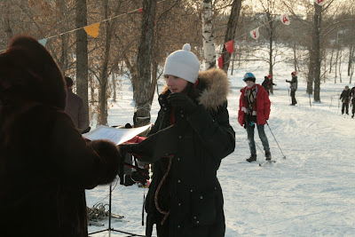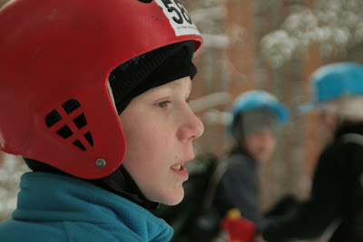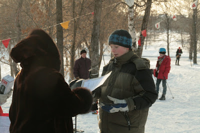 Средние стартовали первыми. А старшие пока катались со склона, а кто-то, это мы с Максом, обсуждали кто и что делает на каждом этапе и тренировались убирать лыжи в чехол.