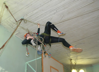 Пришел Игорь Валентинович, рассказал, что будет, что сейчас попробовать. Я долго не могла спустится вниз по навесной, т.к ростом не доставала до нее, поэтому было тяжело прицепиться и получилось у меня это не с первого раза. Сначала я забралась на жумаре туда и просто стояла. Пыталась - пыталась, потом съехала на дюльфере вниз. Второй раз я уже забралась по навесной наверх, потом опять побоялась спуститься. Но как же я так. В третий раз я полезла и решила,что слезу только по навесной и никаким другим способом. Все - таки я нашла в себе силы прицепиться и качнувшись зацепилась ногами за веревку. Да! Я сделала это!