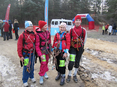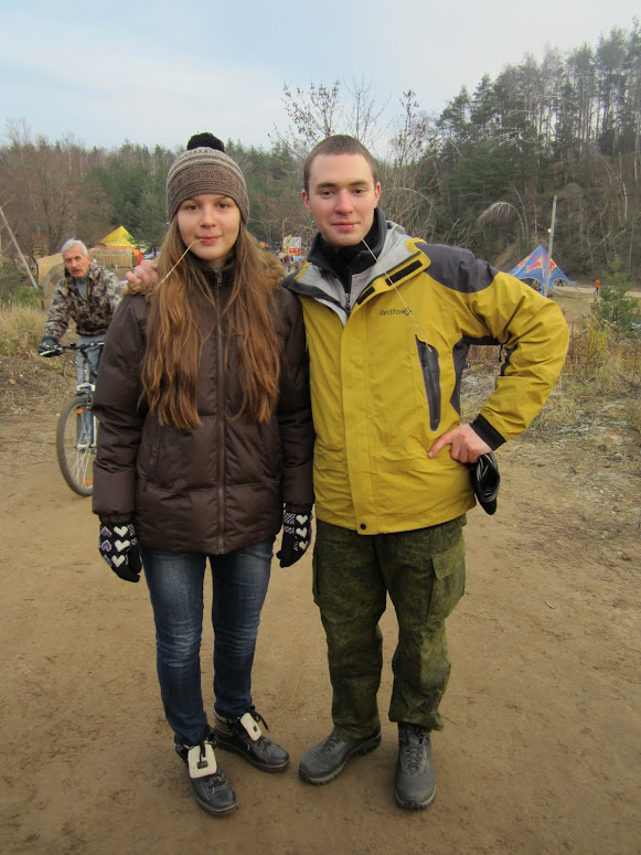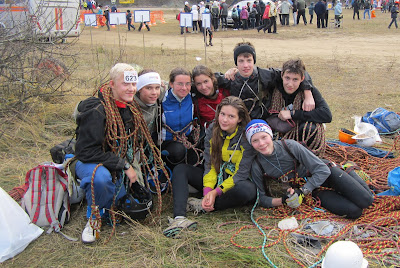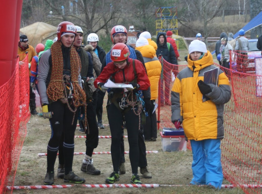 Спустя час, мы с Егором пошли покупать мне шиповки, как и договаривались. Остальные пошли просто по магазинам, которые приехали. Походили, посмотрели, что привезли, купили шиповки (теперь я счастлива ;) ), а потом пошли одеваться на старт. Хорошо дождя не было или снега. Но и без всего этого было ужасно холодно. Лениво мы собирались, медленно одевались. Игорь Валентинович кричал на нас, что мы как улитки и вообще на старт опаздываем! Оделись, взяли веревки. Кстати, о том как мы будем идти дистанцию, мы думали в маршрутке, пока ехали до Лыткарино.
