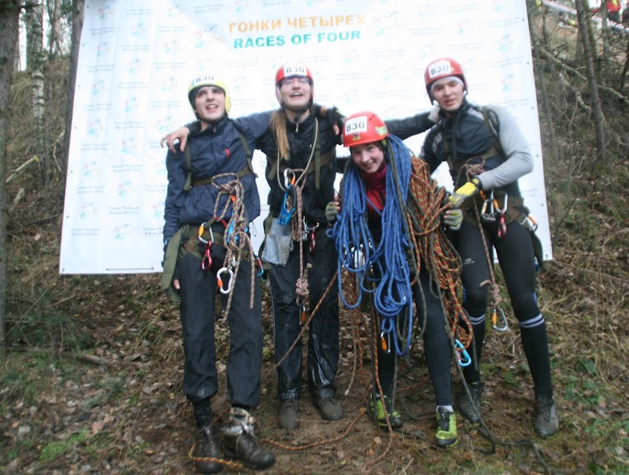 Первый этап подъем. Прибежали и не думая скинули одну веревку и пустили первого Сашу Филимонова. Но вот не удача, веревка запуталась. Ррр. Саша успел подняться, дальше мы начали ее распутывать. Точнее я распутывала, Свят поднимался, а Дима натягивал для него веревку. Потом ушел Дима, а я до сих пор распутывала ее. На это ушло минуты 2-3. Потом я поднялась, мы ее смотали и побежали на спуск, который находился в 20 метрах от подъема. Там нужно было просто спуститься, даже наводить не надо. Поэтому мы пристегивались и улетали вниз. Я ушла первая, чтобы сориентировать карту.