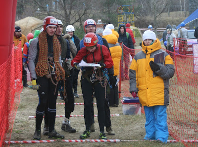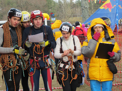 Пройти все этапы Азбуки Безопасности мне с моей командой не удалось до старта, потому что времени не хватило. За час мы пошли одеваться, что бы не как вчера. Когда переоделись, обнаружили, что снаряжения не хватает, причем очень не хватает. А нужно было набрать его на 2 команды, на мою и которая после нас. Мы стартовали предпоследними среди наших. Обвязки были, веревки тоже, а вот с железом проблема. Оделись, веревки подготовили и до старта оставалось 15 - 20 минут, а карабинов все не было. И тогда у нас была паника. Мы хотели уже у Тутаева просить их. За 10 минут до старта произошло чудо, комментатор объявил: "Финишировала команда г.Ярославля Эврика - 6". Тогда мы быстро рванули к финишу, снимать с них карабины. Сняли и помчались на старт. Там нас пригласили сразу же в стартовый коридор. Опять проверили снаряжение и впустили в стартовый квадрат.