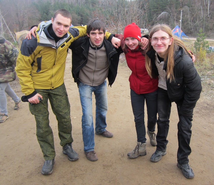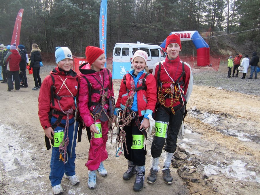 Спустя час, мы с Егором пошли покупать мне шиповки, как и договаривались. Остальные пошли просто по магазинам, которые приехали. Походили, посмотрели, что привезли, купили шиповки (теперь я счастлива ;) ), а потом пошли одеваться на старт. Хорошо дождя не было или снега. Но и без всего этого было ужасно холодно. Лениво мы собирались, медленно одевались. Игорь Валентинович кричал на нас, что мы как улитки и вообще на старт опаздываем! Оделись, взяли веревки. Кстати, о том как мы будем идти дистанцию, мы думали в маршрутке, пока ехали до Лыткарино.