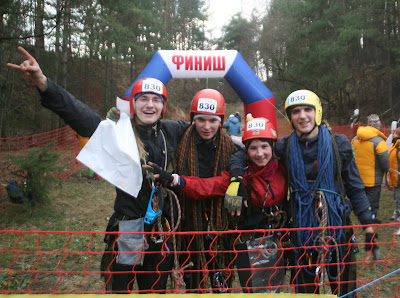 Первый этап подъем. Прибежали и не думая скинули одну веревку и пустили первого Сашу Филимонова. Но вот не удача, веревка запуталась. Ррр. Саша успел подняться, дальше мы начали ее распутывать. Точнее я распутывала, Свят поднимался, а Дима натягивал для него веревку. Потом ушел Дима, а я до сих пор распутывала ее. На это ушло минуты 2-3. Потом я поднялась, мы ее смотали и побежали на спуск, который находился в 20 метрах от подъема. Там нужно было просто спуститься, даже наводить не надо. Поэтому мы пристегивались и улетали вниз. Я ушла первая, чтобы сориентировать карту.